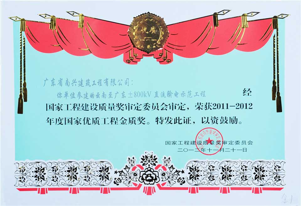 云南至廣東±800KV直流輸電示范工程榮獲國家優(yōu)質(zhì)工程金質(zhì)獎(2011-2012年)