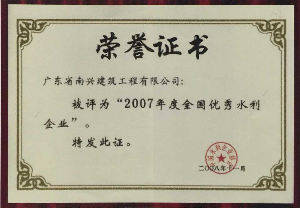 2007年全國優(yōu)秀水利企業(yè)獎狀