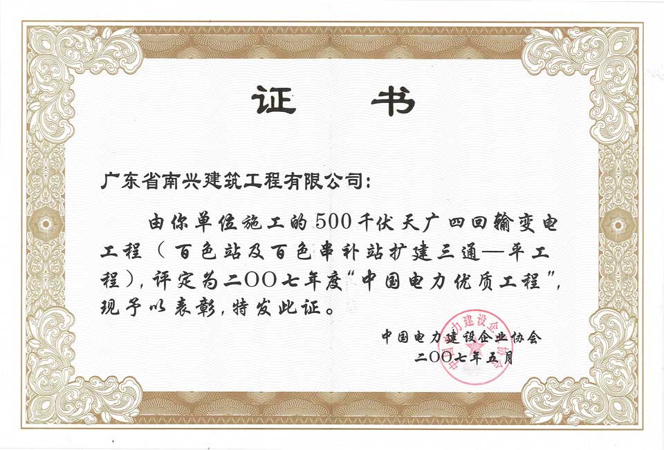 500千伏天廣四回輸變電工程(百色站及百色串補站擴建三通一平工程)獲優(yōu)質(zhì)工程獎(2007年)