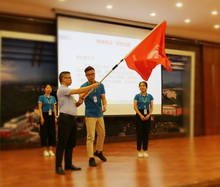接下來,新學(xué)員代表上臺宣誓并簽署誓詞,承諾嚴(yán)格遵守培訓(xùn)要求、秉承鐵漢核心價值觀,認(rèn)真學(xué)習(xí)、積極參與,在培訓(xùn)中自我成長。樊杜平接過新學(xué)員簽署的承諾書并授旗,與全體參會人員及學(xué)員齊唱《鐵漢之歌》。